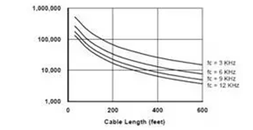 變頻器的載波頻率越高,輸出電流波形越接近正弦波,這會降低電機的運行溫度,從而延長絕緣的壽命。但是,更高的載波頻率意味著每秒鐘產(chǎn)生的尖峰電壓數(shù)量更多,對電機的沖擊的次數(shù)更多。圖4給出了絕緣壽命隨著電纜長度與載波頻率的變化。從圖中可知,對于200英尺長的電纜,當載波頻率從3kHz提高到12kHz(變化4倍)時,絕緣的壽命從大約8萬小時降低到2萬小時(相差4倍)。